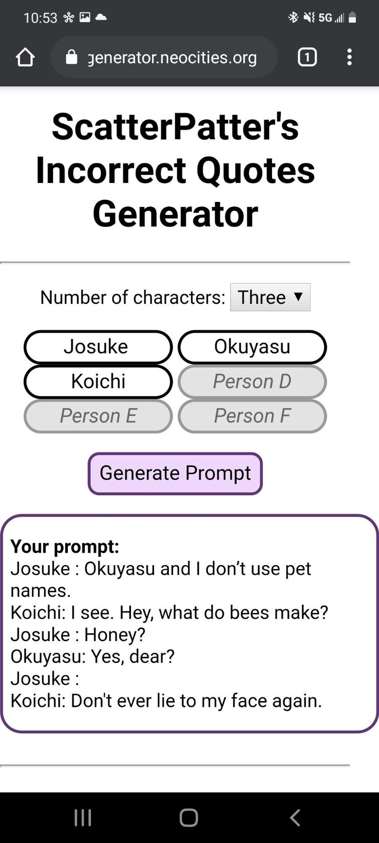 Scatterpatter\'S Incorrect Quotes Generator / Scatterpatter S Incorrect Quotes Generator Yorickmains - But it doesn't matter, since.. If you need inspiration or simply lack time, choose the pack you like and click random to see an discover flaticon pattern generator and create patterns easily with more than 2 million customizable icons to choose from. In the future i plan to implement a feature to filter out prompts that involve shipping, but until then i apologize if any prompts. Some prompts may imply shipping between 2 or more characters. Aplikasi untuk inject voucher xl kosong : We've seen some people use this website scatterpatter's incorrect quotes generator to generate funny lil' prompts with jojo characters and screenshotting them.